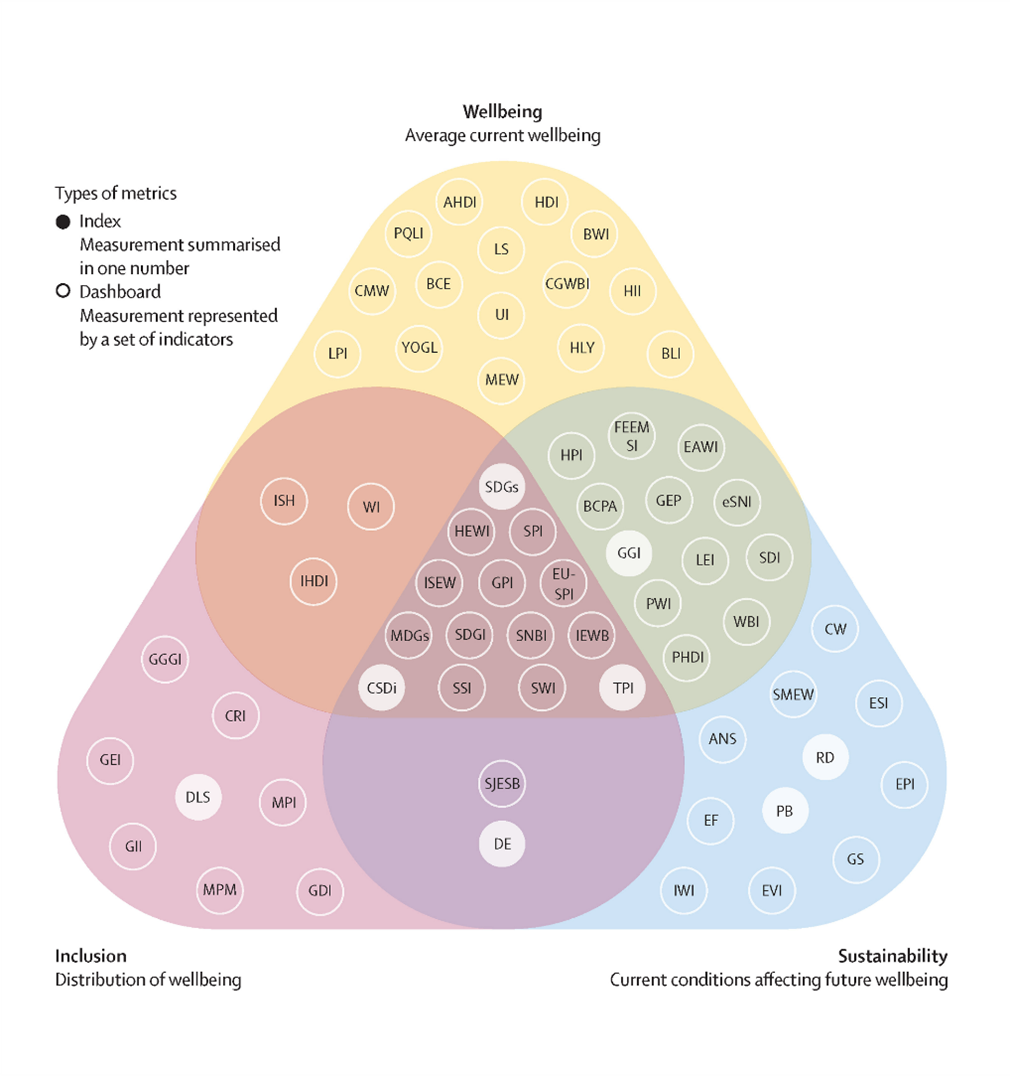Figure 1. a. Wellbeing, inclusion, and sustainability triangle of Beyond GDP metrics. The triangle shows an overview of 65 Beyond GDP metrics that are plotted based on the dimension they relate to: wellbeing, inclusion, or sustainability, or a combination of two or three of these dimensions. The explanation of the acronyms can be found in the original paper.