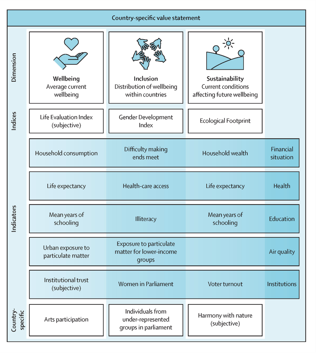 Figure 1. b. An example structure for a dashboard of wellbeing, inclusion, and sustainability. The framework includes a headline space for country-specific value statements to reflect country-specific values. The dashboard is built along two axes: the conceptual dimensions of wellbeing, inclusion, and sustainability on the one hand, and thematic domains. The dashboard includes exemplary indices, subjective and objective indicators and country-specific indicators. Indicators are structured based on their relation to the conceptual and thematic domains. Source: Jansen et al. (2024).