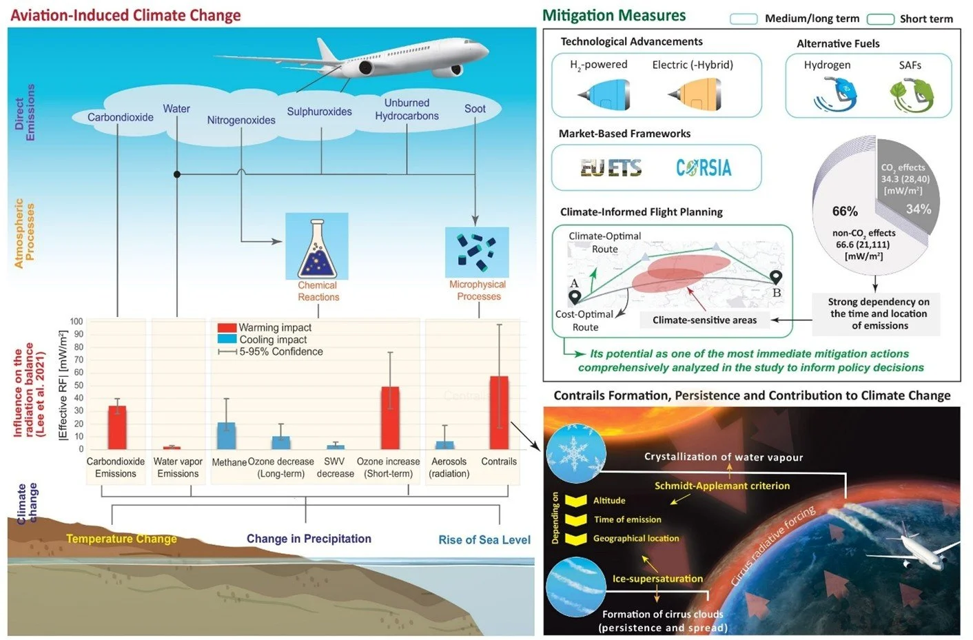 Figure 1. Infographic depicting aviation-induced climate change processes and mitigation measures.
